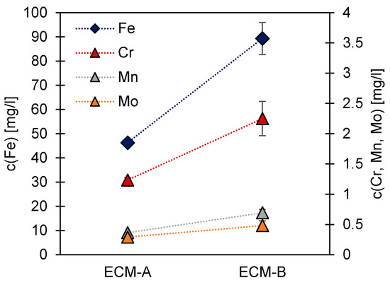 ICP-MS analysis of iron, chromium, manganese and molybdenum after ECM-A (20.6 A/cm2) and ECM-B (34.0 A/cm2) processing in sodium nitrate electrolyte.