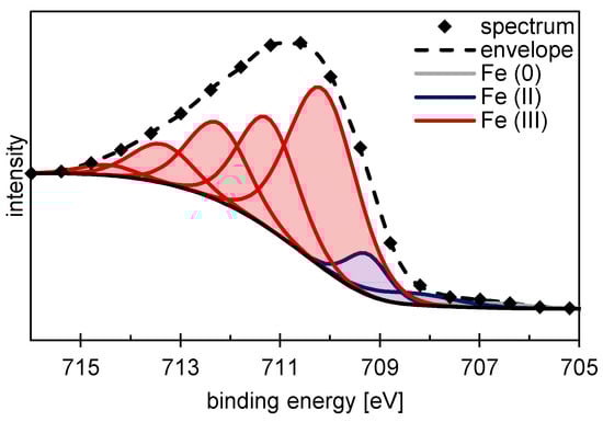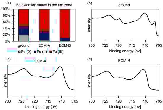In addition to the content of the different elements, the XPS measurements also provide information about the stoichiometric composition and structure of the formed oxides at the surfaces. Iron is by far the most important metallic component in the material and is therefore a particular focus of attention. According to common models from previous research, the structure Fe3−xO4 is assumed to be simplified for the oxide layer. X is the variable iron deficiency. According to Biesinger et al. [], the measured graph of the Fe 2p3/2 region, which is shown as an example for the ECM-B surface in Figure 3, can thus be fragmented into the components metallic iron Fe (0), divalent iron Fe (II) and trivalent iron Fe (III), as demonstrated in Table 6.
