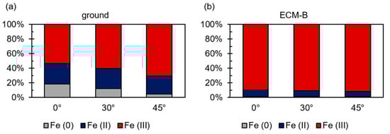 Angle-resolved XPS measurements to determine the oxidation states of iron for (a) ground and (b) ECM-B 42CrMo4 steel.