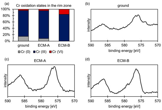 Chromium was analyzed in addition to iron using XPS. The XPS fitting parameters for chromium were taken from Biesinger et al. []. The results of the XPS measurements reveal that chromium shows almost the same qualitative results as those for iron. As Table 7 and Figure 6 reveal for the Cr 2p3/2 region, a significant metallic content was detected in the ground surfaces. This was significantly lower for the ECM surfaces and was related to the fluctuation of the measurements, and was therefore neglected. It is also noticeable that the proportion of hexavalent chromium in the oxide on the surface increases with increasing current density compared to the predominant trivalent chromium.