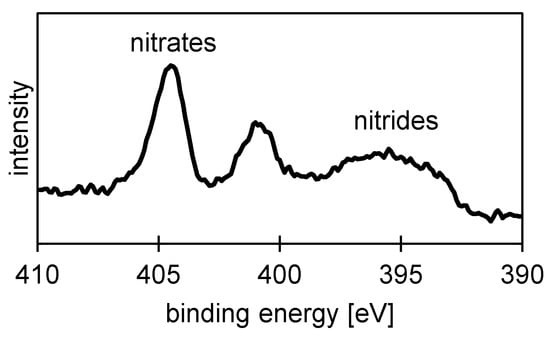 Considering the current research and the controversy when discussing the formation of a nitrate-based polishing film during ECM in sodium nitrate solutions, XPS measurements were also performed to obtain detailed results on the occurrence of such a film. The XPS measurements (Figure 7) qualitatively indicate the formation of such a film. Different nitrogen compounds were only found on the ECM surface with the highest current density (ECM-B), such as metal nitrates and metal nitrides [,]. No indication of the formation for a nitrate-based polishing film was found for the ECM-A process. It is assumed that based on the small amount of nitrogen components found for the ECM-B process only some residuals of the polishing film were observed.