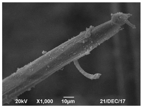 Early forms of acrylic fibers exhibited low strength and elastic modulus, as well as poor resistance to acids and alkalis, which limited their applications in concrete [18]. However, the new generation of acrylic fibers have shown little to no sensitivity to the alkalinity of concrete. Some research studies have reported small long-term sensitivity to alkaline environments, especially at higher temperatures [47], while others have reported that acrylic fibers are not sensitive to chemical degradation [75,76]. Hahne et al. [77] studied the performance of FRC made with high-strength PAN fibers. The study explored high-strength acrylic fibers of different lengths (i.e., 6–24 mm) and diameters (i.e., 18–104 micrometers), as well as strengths (up to 1000 MPa) and elastic moduli (up to 19.5 GPa) for their fiber-matrix bond properties. It was reported that acrylic fibers form a satisfactory bond with the concrete matrix, due to their irregular cross-sectional shapes. Confirming this assessment, Jamshidi and Karimi [76] exploited 3–4 mm fibers and found that acrylic fibers, similar to nylon fibers, form a stronger bond with the concrete matrix, in comparison to PP fibers, partly due to the formation of cement hydration products on the fiber surface, as illustrated in the SEM image provided in Figure 4 [76].
