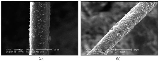 Figure 5. SEM images of glass fibers after alkali exposure: (a) silica glass fiber and (b) basalt glass fiber [84].