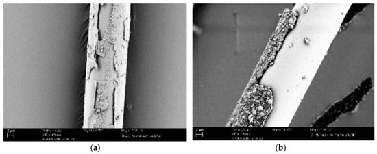 Figure 3. SEM images of recycled PET fibers after (a) 42 days and (b) 164 days of exposure in the cement mortar [73].