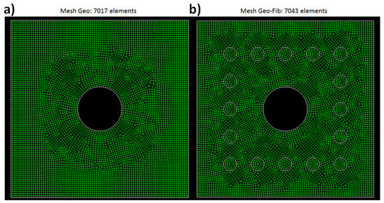 Cross-section mesh of the storage element used for simulations. (a) Mesh Geo without fibres. (b) Mesh Geo-Fib with fibres.
