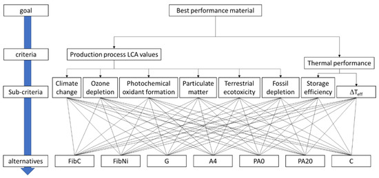 To give support in the decision-making process at the industrial level, the thermal and environmental performances obtained were also evaluated through the Super-Decisions simulation program. This software provides a powerful methodology for combining judgment and data to effectively rank options and predict outcomes. Several authors [34,35] showed that, following the combined LCA-Analytical Hierarchy Process (AHP) Multi-Criteria Decision Making (MCDM) approach, it is possible to obtain the best evaluation of the behaviour of materials from the point of view of performance and environment. This kind of approach has been used by the scientific community, due to its simplicity and robustness for sustainable evaluation [36] and has already been used to choose sustainable materials based on their features [37].