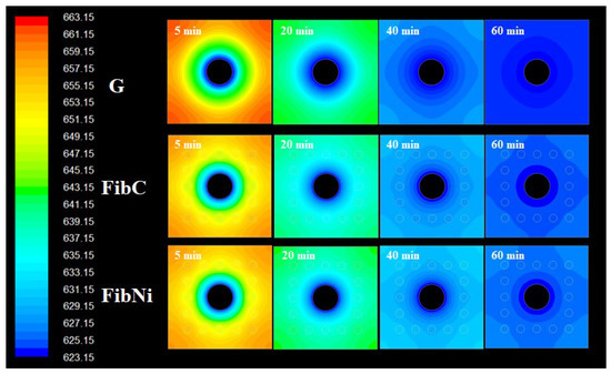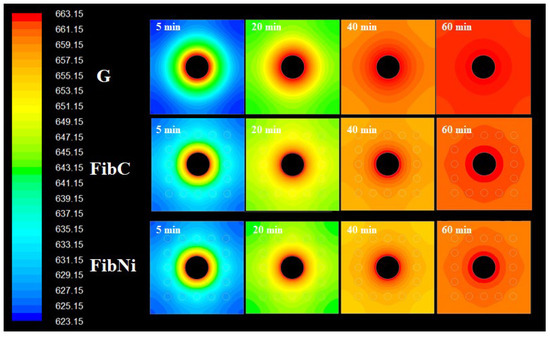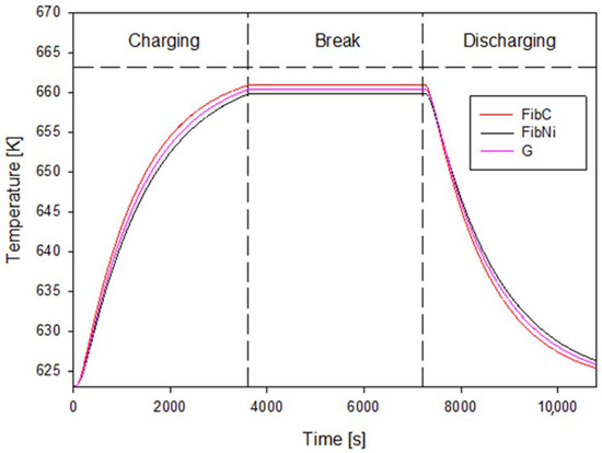 However, it should be noted that, although the discharge contours were very different, the average temperature at the wall after discharge (Figure 5) was almost similar for G and FibC, while the FibNi discharged and charged slowly. In fact, at the beginning of the thermal cycle, the three storage modules had the same identical status at the charge, but at the discharge phase, the initial condition of the material was that at the ending of the charging phase; hence, the initial temperature distribution is not the same for all three materials, thus better reflecting the actual behaviour of the modules for real applications. In ideal conditions, the charge and discharge are perfectly reversible; hence, the temperature profiles, e.g., Figure 5, tend to be specular and symmetric, and it is only possible to modulate and tune different times and durations of the charge/discharge phase.