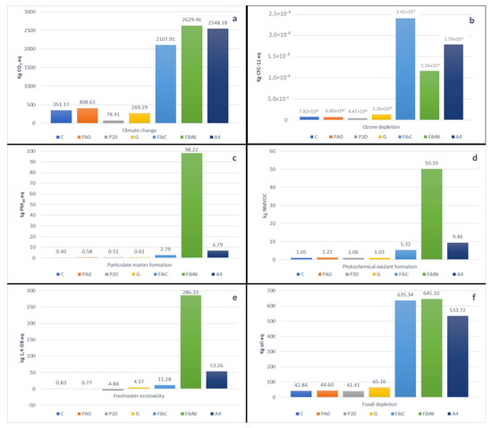 The ReCiPe hierarchic midpoint method allowed us to estimate all the impact factors for each material of all the products and the contribution of transport and energy depletion during the production process. The most important impact categories are shown in Figure 6.