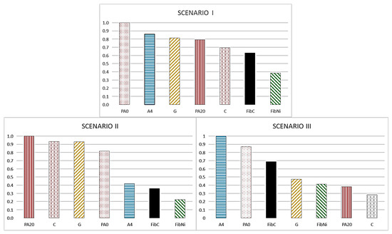 To better understand whether these materials can have a real use from an environmental point of view, it was deemed necessary to carry out a weighted comparison of the technical characteristics of the materials and the environmental impact associated with their production process, by using the Super-decisions software. The Super-decisions multi-criteria analysis results are reported in Figure 7. The values are normalized to the best material for each scenario so that the best option has a value of 1 and the others show a lower level of performance proportional to the best material.