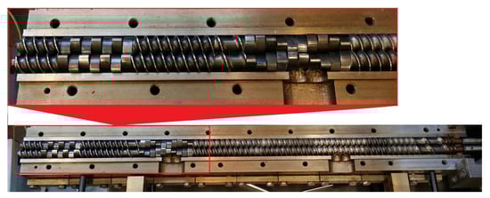 View of the extruder open plasticizing system with used processing screws.