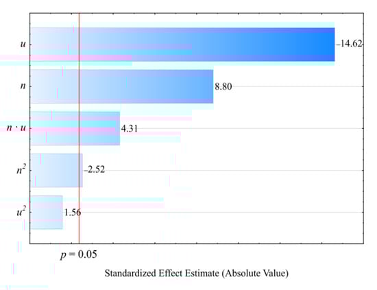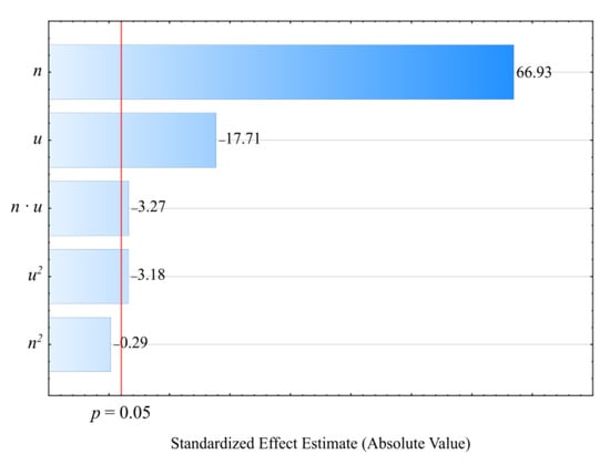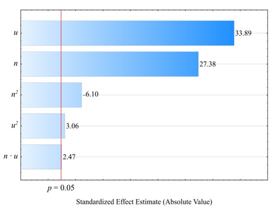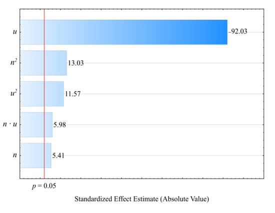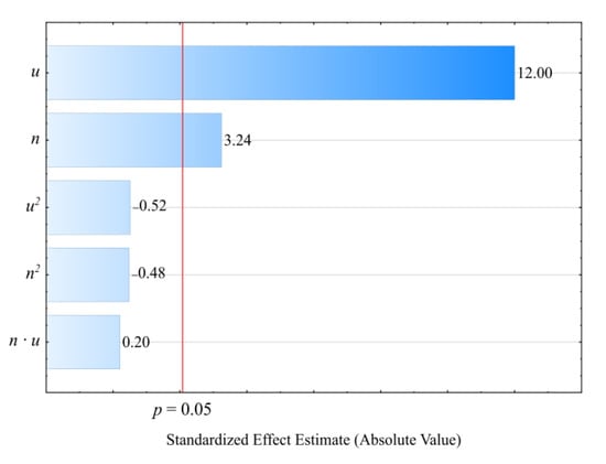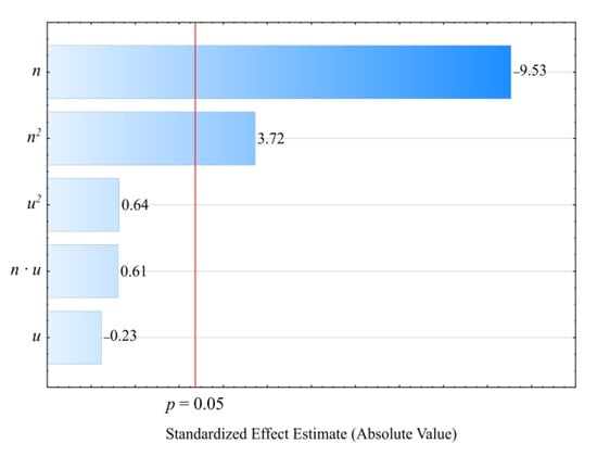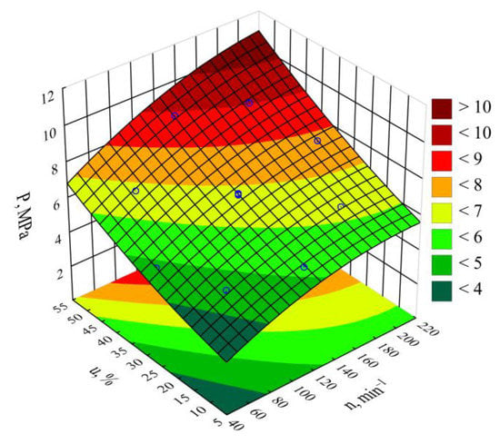 Table 4 and Figure 6 reveal the outcome of a statistical analysis involving the impact of variable factors on pressure. Increasing both the screw rotational speed and the bran content resulted in a significantly higher processed blend pressure (Figure 7). This increase comes from enhancing both the mass flow rate of the extruded polymer blend (where a higher transport efficiency with the same cross-section of extrusion head channels results in an obvious increase in pressure) and its viscosity. The increase in the blend viscosity results from the shortened duration of its residence within a plasticizing system, as well as increasing bran content [,,]. The highest pressure increase of 3.1 MPa (65%) is the end product of a fourfold increase in the screw speed. This was observed between comparable (with the same bran content of 30%) experimental design layouts 5 and 6. In contrast, reducing the bran content within the studied range from 10 wt.% to 50 wt.% (experimental design layouts 7 and 8) caused the pressure of the processed blend to increase by 3.8 MPa (75%). The modeling of the results also showed the presence of a statistically significant interaction between n and u, albeit with a much lower influence.