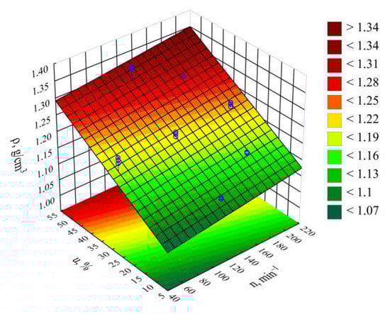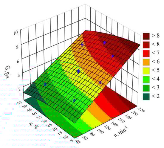 Figure 2 and Figure 3 show the results for modeling the mass flow rate of the extruded material G. The studies adopted an empirical model in the form of a polynomial (Equation (2)):