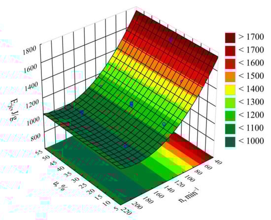 The statistical analysis involving the impact of the studied extrusion conditions on the specific energy consumption showed that extruder screw rotational speed n had a statistically significant impact (Figure 8). The statistical analysis results regarding the adopted model Ejc are shown in Table 5. Increasing the screw rotational speed resulted in a reduction in specific energy consumption. A fourfold increase in the processing screw rotational speed, from 50 min−1 to 200 min−1, resulted in a recorded decrease in the Ejc value by 771 J/g (45%). This is due to the increase in the flow rate of the extruded material prevailing over the increase in the flux of energy supplied to the extruder. It also results from an increase in the shear stresses, together with the screw rotational speed, which leads to additional overheating of the blend due to internal friction. That PBS and LFC temperatures increase with the increase in the screw rotational speed was demonstrated in the source literature using a torque rheometer []. The thus-obtained autothermal effect enables spontaneous maintenance of the set temperature within the plasticizing system cylinder wall, and, hence, less frequent activation of the heaters in all nine heating zones. Therefore, in the case of high rotational speed values, due to the intensity of the autothermal phenomenon, the temperature must be lowered to a set level, and this is achieved by a pump forcing liquid circulation in the cooling system, hence, the inhibition of further decrease in the specific energy consumption. On the other hand, no significant impact within the set bran content range on the specific energy consumption was found. Figure 9 shows the response surface for the specific energy consumption depending on the aforementioned factors, as obtained through modeling.