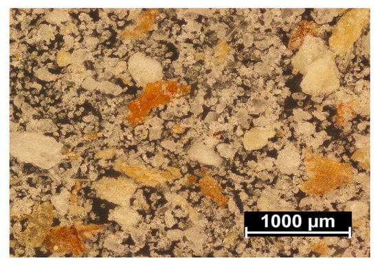 Figure 10 shows a microphotograph of the used filler in the form of wheat bran, after separating the fractions on a sieve with a mesh size of 0.2 mm. The image shows brown or light-brown flakes, similar in size to the upper range or smaller, formed as a result of their thinning. These are the actual bran, i.e., a water- and oxygen-permeable cellulose- and lignin-rich wheat grain husk. Significant amounts of smaller structures, in the form of white and grey crystals, were also observed. These are fragments of the aleurone layer, which is the outermost endosperm layer, containing mainly proteins and fats, as well as the middle endosperm, which primarily consists of starch. The degree of bran contamination with endosperm particles depends mainly on the grain grinding method, the type of wheat and the brittleness of grain outer layers, i.e., bran and the aleurone layer. Hard cultivars of wheat contain more brittle bran, which tend to chip off in small pieces together with endosperm fragments, during grinding. In the grinding of soft cultivars of wheat, the bran is more flexible and comes off in the form of large flakes, but it is also more challenging to grind into fine powder. Thus, wheat bran composition can significantly differ [,,,].
