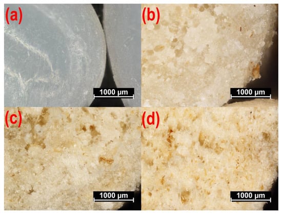 Microscopic images of PBS pellets and composite pellets obtained at a screw rotational speed of 125 min−1 are shown in Figure 11. The observed cross-section of PBS pellets provided by the manufacturer (Figure 11a) does not indicate any defects, with the pellets being white. The photos showing pellets with a bran content of 10 wt.% (Figure 11b), 30 wt.% (Figure 11c) and 50 wt.% (Figure 11d), however, indicate numerous defects in the form of pores. The cause behind their formation was the presence of structurally-bound water in the filler particles. This expanded after leaving the extrusion head and meeting the reduction in atmospheric pressure. In this situation, the greater the WB content, the higher the pore quantity. Figure 11b shows individual pores of regular shape, located solely near the pellet center. This is associated with the small amount of bran and rapid crystallization of the outer material layer when cooled within the water bath. In the case of higher WB content (Figure 11c,d), the pore count increases, and these interconnect into larger, irregular voids that appear near the pellet edge. Still, a uniform distribution of the filler was found in all cases, and WB particles were observed both within the material mass as well as on the surface of the biocomposite pellet. The color of the blend changes with increased WB content.