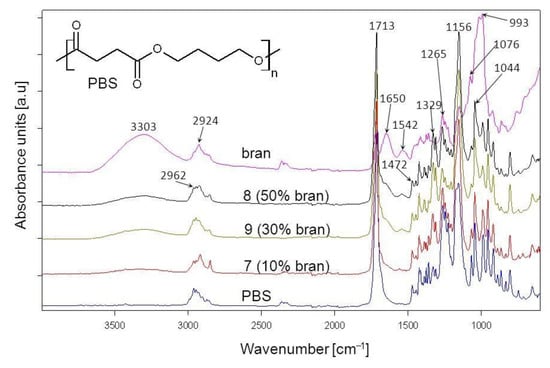 ATR-FTIR spectra of PBS, bran and their composites obtained pursuant to research plan system 7, 8, 9 with different bran content.