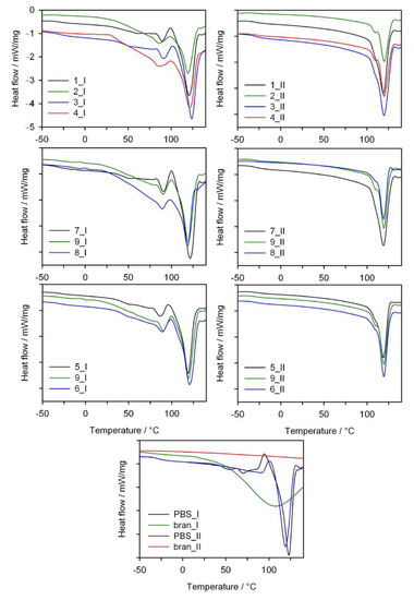 DSC thermograms of the first (I) and second (II) heating scans of neat PBS and its composites with bran (exo up).