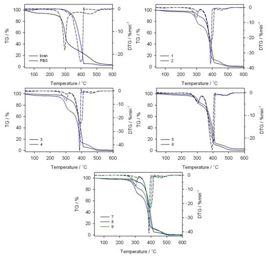 TG and DTG curves obtained in an oxidizing atmosphere for bran, PBS and their composites.