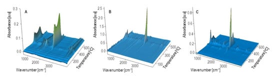 - Thermogravimetry (TG) testing of the extrudate in an oxidizing atmosphere. This was conducted with the use of an STA 449 F1 Jupiter thermal analyzer (NETZSCH, Günzbung, Germany) connected with a TENSOR 27 FTIR spectrophotometer (Bruker, Germany), which allowed simultaneous analysis of the gas products of the sample decomposition. The analyses were conducted in a temperature range of 40–800 °C, in an atmosphere of synthetic air with a gas flow rate of 25 mL/min. Samples, each weighing approximately 12 mg, were analyzed in Al2 O3 crucibles.