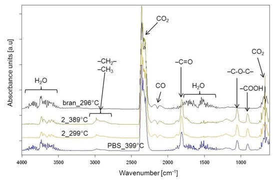 The thermal resistance of the obtained PBS/WB composites, in a synthetic air atmosphere, was studied through thermogravimetric analysis. The tests also involved analyzing gaseous composite decomposition products. Figure 14 shows the TG and derivative thermogravimetry (DTG) curves for the tested materials, while Table 7 contains basic parameters characterizing their thermal resistance. The PBS TG curve shows that it decomposes in one major step, with the maximum at 399 °C and a mass loss of 94.3%. Based on the FTIR spectrum for gaseous decomposition products (Figure 15 and Figure 16), one can conclude that this decomposition starts with ester bond hydrolysis, which leads to the formation of succinic acid and 1,4-butanediol [,], followed by an immediate oxidation process. Such a course of thermal degradation is evidenced by absorption bands at 2981–2897 cm−1 (vibrations of the –CH2– and –CH3 groups present in succinic acid and 1,4-butanediol), at 1811 cm−1 (–C=O present in succinic acid), 1053 cm−1 (–C-O-C– in succinic acid and 1,4-butanediol), 909 cm−1 (–COOH in succinic acid), as well as intensive absorption bands at 2359–2310 cm−1 and 669 cm−1 originating from carbon dioxide and at approximately 4000–3500 cm−1 and 1800–1300 cm−1 originating from water.