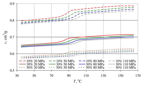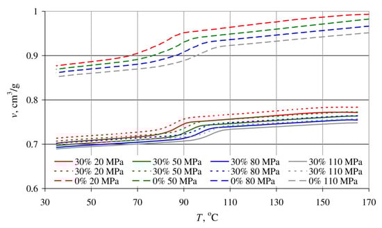 - Determining the relationship between pressure p, specific volume v and temperature T during isobaric cooling. This occurred as per standard ISO 17744:2004 []. The measurements were conducted using a p-v-T 100 device from SWO Polymertechnik GmbH (Krefeld, Germany). The tested samples were heated up to a maximum measurement temperature of 165 °C and pressurized to a preset value (20, 50, 80 and 110 MPa). Next, the constant pressure was maintained and the samples were cooled down at a rate of 5 °C/min, down to a temperature of 35 °C, after which the process was repeated for the subsequent, higher pressure value.