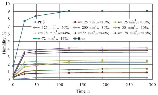 - Establishing the moisture content of the obtained biocomposite pellets in wt.% according to standard EN ISO 585:1990 []. This resulted from measurement using a Radwag WPS 50 SX moisture analyzer (Radom, Poland). The pellets were first subjected to preliminary drying in a heating chamber at 80 °C for 48 h. The samples were then kept in an isolated room, with a humidity of 33% and a temperature of 20.8 °C. A moisture analyzer was used to measure the moisture of biocomposite pellets weighing 2.2–2.5 g (several dozen pellets), at a temperature of 120 °C. The measurements were taken after drying and after 1, 2, 5, 8 and 12 days, until all tested samples achieved equilibrium moisture content.