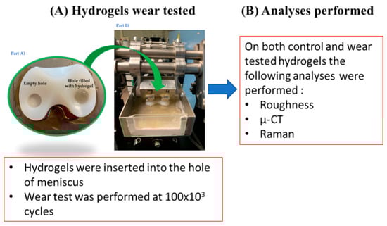 Workflow of the designed protocol: description of hydrogels wear tested. (A) Ultra-high-molecular-weight polyethylene (UHMWPE) specimens with the insertion of the hydrogels. A section of the station of the knee simulator with femoral and tibial parts mounted. (B) Analyses performed on both control and wear tested hydrogels.