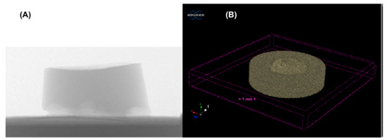 Additional analyses were performed on all specimens tested using micro X-ray computed tomography (μ-CT). In particular, μ-CT characterization was used since it allows global wear volume, local wear distribution, and deformations to be evaluated [31,32]. μ-CT has the potential of obtaining quantitative three-dimensional information of the entire object geometry in a non-destructive and non-contact way [22]. Microscopic examination of all hydrogel constructs was performed using the non-invasive X-ray detection μ-CT (Skyscan 1072, Bruker Corp., MicroCT unit, Kontich, Belgium) in order to assess the uniformity of the molecular structure. The exposure time was set at 5936 ms using a beam of 50 kV −197 µA. In Figure 2, the set-up of the specimens’ acquisition using μ-CT is shown.