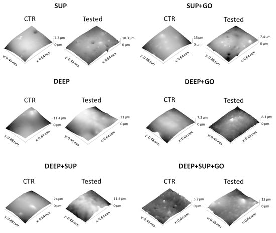Tridimensional reconstruction of the hydrogel surface under study: control (CTR) and tested samples (SUP, DEEP, DEEP+SUP without or with (+) GO).