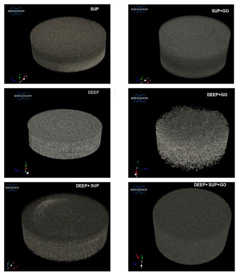 Representative images of binarized and reconstructed μ-CT images for each specimen (SUP; SUP + GO; DEEP; DEEP + GO; DEEP + SUP; DEEP + SUP + GO).