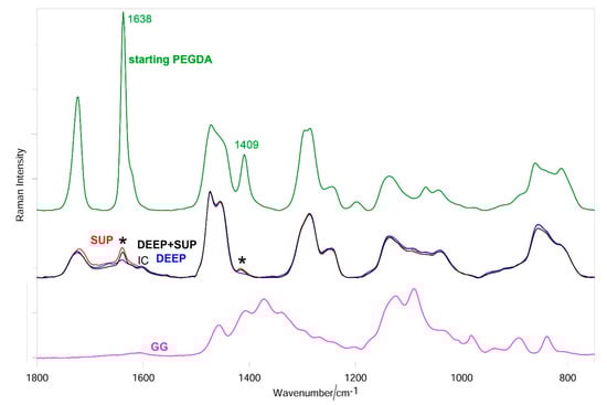 Figure 6 shows the average Raman spectra of SUP, DEEP, and DEEP + SUP hydrogels; the spectra of uncrosslinked PEGDA and GG are reported for comparison. As can be easily seen, the spectra of the hydrogels are dominated by the bands of PEGDA and no spectral features of GG were detected according to its low content in the blend. Going from starting PEGDA to SUP and DEEP hydrogels, the bands due to the diacrylate groups progressively weakened but did not disappear. In the DEEP + SUP sample the diacrylate bands had intermediate intensities between SUP and DEEP hydrogels, although more similar to the SUP specimen. Analogous trends were observed in the spectra of the samples after drying (Figure S4, Supplementary Material).