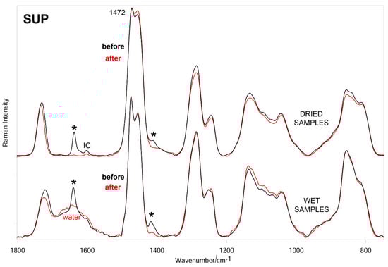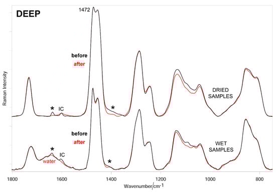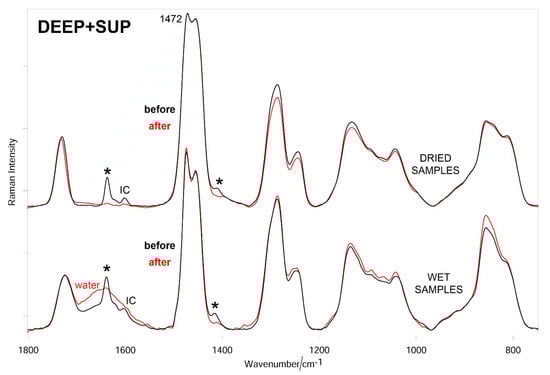 Average Raman spectra (normalized to the intensity of the CH2 bending band at about 1470 cm−1) of DEEP + SUP hydrogels before and after testing (wet and dried samples). The main bands that decrease in intensity upon testing are indicated with an asterisk. The band at 1601 cm−1 is assignable to Irgacure2959 (IC).