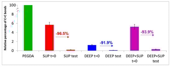 In all the cases, a significant decrease in intensity of the bands due to diacrylate groups was observed upon testing both in wet and dried samples. From a more quantitative point of view, the trend of the relative percentage of C=C bonds in the hydrogels under study was calculated according to Equation (1). Figure 10 confirms these qualitative results.