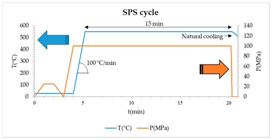 The powders were consolidated by Spark Plasma Sintering (Dr Sinter SPS 632Lx, Fuji Electronic Industrial CO., Saitama, Japan) at the Plateforme Nationale CNRS de Frittage Flash (Toulouse, France). The powders were loaded into a graphite die. A sheet of graphitic paper was placed between the punch and the powder and between the die and the powder for easy removal. The SPS process was performed in vacuum (residual cell pressure < 10 Pa) using a direct current pulse pattern of 40 ms: 7 ms (pulse on: pulse off). The temperature was controlled using a K-thermocouple introduced in a hole (5 mm deep) drilled on the outer surface of the die. The samples were heated (100 °C/min) up to 550 °C where a 15 min dwell was applied. A uniaxial charge (corresponding to 100 MPa on the powder bed) was applied at room temperature and maintained during the heating and dwell steps (Figure 1). Natural cooling was applied down to room temperature and the uniaxial load was gradually released at the same time.