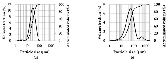 Particle size distribution: (a) AA7075 powder; (b) AA7075-M powder. The solid lines represent the volume fraction and the dashed lines represent the cumulative volume.