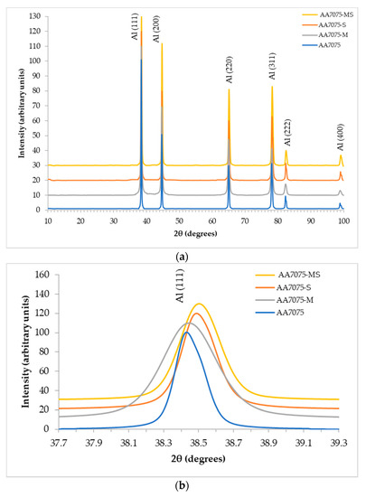 Using Bragg′s Law for cubic structures, the lattice parameter a0 of the powder and consolidated samples was calculated. Comparing the lattice parameter of the powder samples (0.40549 nm for AA7075 and 0.40553 nm for AA7075M) shows that there is no significant variation. The same occurs for AA7075-S and AA7075-MS, with lattice parameters of 0.40498 and 0.40491 nm, respectively. Comparing the consolidated samples with the powder samples, there is a reduction of about 0.13–0.15%. The reduction in the a0 occurs due to the formation of a supersaturated AA7075 solid solution caused by the dissolution of smaller Zn and Cu atoms in the Al lattice [38,41].