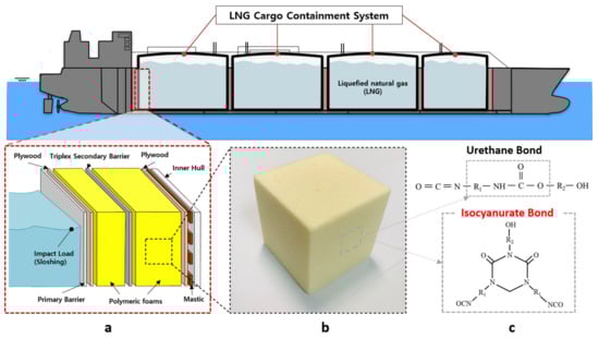 Polymeric foams are widely used as insulation materials in sandwich structures because of their low density, excellent energy absorption ability, low moisture permeability and good insulation performance [,]. Rigid polyurethane foam can be distinguished as polyurethane foam (PUF) and polyisocyanurate foam (PIF) among the organic and inorganic insulation materials, and they are employed as insulation in buildings, LNG gas storage tanks, and insulating materials in LNG pipes. Glass-fiber-reinforced polyurethane foam, named R-PUF, has primarily been adopted for Mark-III type LNG cargo containment systems in order to withstand the fluid impact load. Polymeric foams used in LNG containment systems are required to withstand not only the sloshing and self-gravity of LNG but also to minimize the BOR and protect the hull structure from the effects of cryogenic temperatures []. In particular, PIF, which is a thermal insulation material that can be used over a wide range of temperatures (−235 to 230 °C), has a lower thermal conductivity (0.02–0.03 W/mK) than other polymeric foams such as PUF (0.032 W/mK) and R-PUF, which are commonly used in membrane cargo tanks that are used to store LNG [,,].