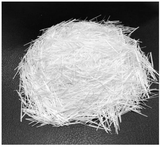 The polyol mixture was used to prepare PIFs with commercially available polyols from BASF company (Ludwigshafen, Germany)—Lupraphen 1901/1 (difunctional polyester polyol based on aromatic dicarboxylic acids). Properties of the polyol mixture used in this study are summarized in Table 1. Isocyanate (Lupranat M50) used in the reaction was 4,4′-diphenylmethane diisocyanate (MDI) characterized by a 31.5% content of NCO groups. HFC 365–227 was used as a chemical and physical blowing agent. Chopped glass fibers (length: 25 mm) were purchased from FRP shop, Korea. Table 2 lists the material characteristics of the chopped glass fibers, and Figure 2 shows the chopped glass fibers used in this study.