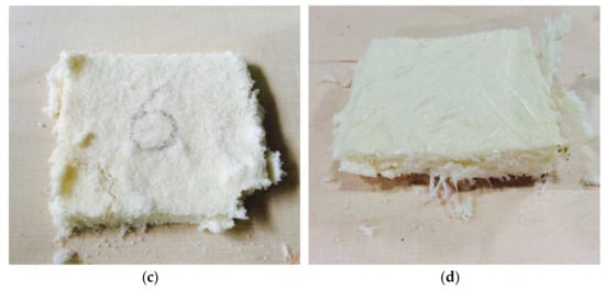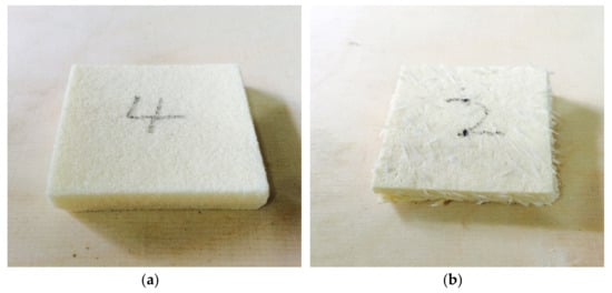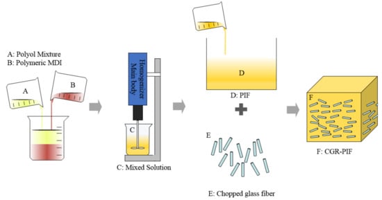 PIF is a cellular, thermoset plastic formed when the two liquids polyol and M50 are combined. In this study, CGR-PIF is fabricated to investigate the effect of chopped glass fibers in PIF. The main constituents of the CGR-PIF are polyol, M50, and chopped glass fibers. Figure 3 illustrates the manufacturing process of the CGR-PIF. Polyol, M50, and the chopped glass fibers were combined in a mass ratio of 180:100:50 to prepare a 15 wt.% CGR-PIF because the R-PUF manufactured in previous studies with 10–15 wt.% of glass fibers had good mechanical properties []. The composition and mixing conditions of PIF and CGR-PIF are shown Table 3. Before adding the chopped glass fibers, polyol and M50 were mixed using a homogenizer (IKA, Staufen, Germany) for 15 s at 6000 rpm. The well-mixed PIF liquids were poured into molds (350 350 300 mm3) to produce free-rise foam. One half was poured in an empty mold to produce pure PIF. The other half of the mixture was poured into a mold with chopped glass fibers at its bottom. The liquids were then pressed to mix with the chopped glass fibers and to align the fibers in the horizontal direction. After 24 h at an ambient temperature of 20 °C, the polymerization reaction was completed.