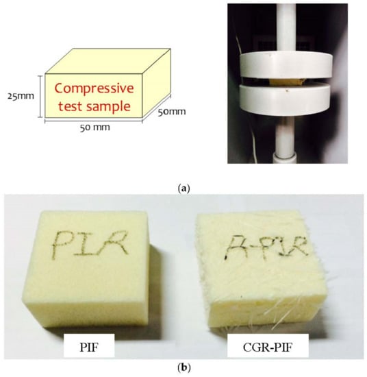 In this study, a homogenizer was used to mix the polyol and M50 at 6000 rpm. As shown in Figure 5a, a universal testing machine (KYOUNGSUNG TESTING MACHINE CO., LTD, Ansan, Korea) for composite materials equipped with a cryogenic chamber and automatic temperature control system was used to investigate the compressive strength of the foams. When nitrogen gas was injected in order to lower the temperature to the cryogenic temperature, the automatic temperature control system prevented the further injection of nitrogen gas once the temperature reached the desired value, and when the temperature started to increase, it lowered the temperature through re-injection such that it was maintained at the desired value. The strain rate was set as 0.001/s (1.5 mm/min) in consideration of the quasi-static load. For the thermal equilibrium of the specimens, precooling was performed for 1 h, and then, compression tests were performed. Table 4 shows the conditions under which the compressive strength was evaluated. In order to analyze the cell morphology of the PIF and CGR-PIF, scanning electron microscopy (FE-SEM SUPRA25, ZEISS, Oberkochen, Germany) was used. In addition, the thermal conductivity was measured using laser flash analysis (LFA, Netzsch, Selb, Germany), which is widely used to measure the thermal diffusivity of metals, composites, ceramics, and other materials by using laser pulses in the temperature range of room temperature to 500 °C. The LFA comprised three parts: the light source at the bottom, the sample in the center, and the detector on top. A laser pulse from the power source hits the bottom of the sample. As the laser pulse energy was absorbed at the surface of the sample, the temperature of the rear surface was monitored using the detector. By measuring the thermal diffusivities of the specimen, the thermal properties such as thermal conductivity and specific heat were calculated [].