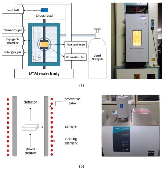 Photographs and schematic of test apparatus. (a) Universal testing machine equipped with cryogenic chamber. (b) Laser flash analysis.