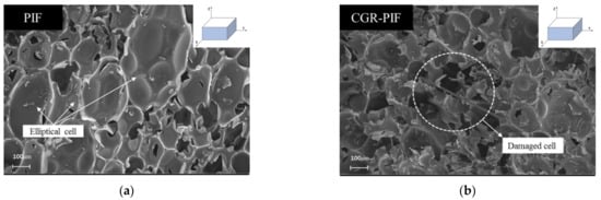 Cell morphologies of the PIF and CGR-PIF along the surface parallel to the foaming direction for (a) PIF and (b) CGR-PIF.