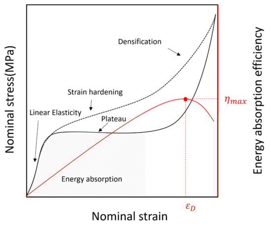When a load is applied to the polymeric foam, work is done by the forces acting on it, which is called specific energy. The work per unit volume (specific energy) used to deform it to a densification strain is represented by the area under the stress–strain curve up to . The densification strain, , is the strain corresponding to the maximum energy absorption efficiency (Figure 8), whereby energy absorption efficiency () is defined as the ratio of specific energy to the current stress using Equation (1) [,,].