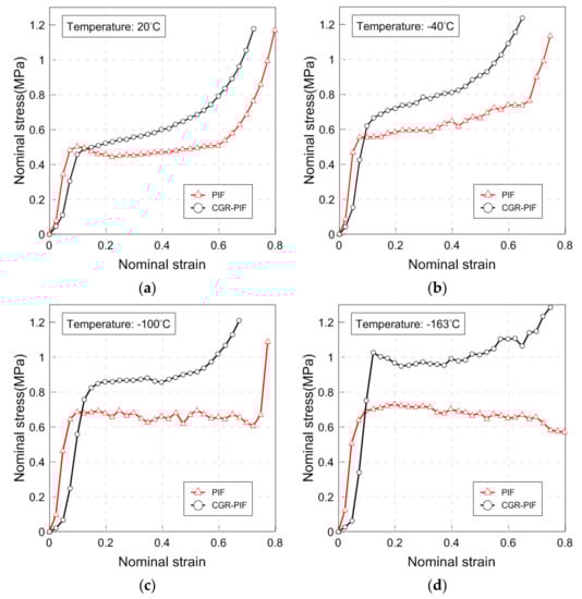 Stress–strain curve of the PIF and CGR-PIF at (a) 20, (b) −40, (c) −100, and (d) −163 °C.