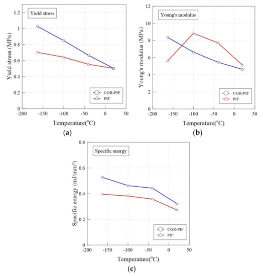 Compressive properties: (a) yield stress, (b) young’s modulus and (c) specific energy of PIF and CGR-PIF at various temperatures.