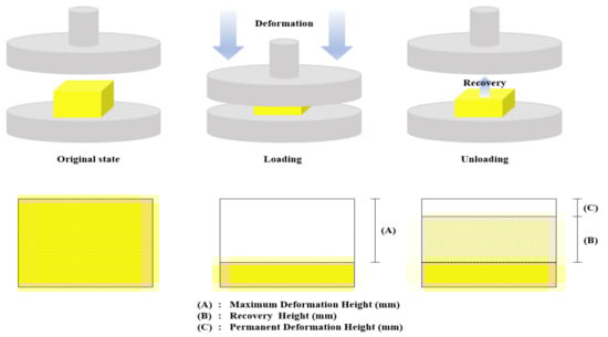 After the polymeric foam is compressively deformed, recovery occurs in the direction in which the deformation occurs. This can cause dimensional instability under LNG loading (compressively deformed) and unloading states (recovery) in LNG insulation system owing to a permanent deformation resulting in strength reduction due to a gap in the insulation structure. In this study, when the load of the universal testing machine applied to the testing sample reached 5 kN, the compressive loading was terminated. As soon as the test was terminated, the maximum deformation height of the tested sample was measured to calculate the maximum deformation ratio. After 24 h at ambient temperature with no external loading, the permanent deformation height of the tested sample was measured to calculate recovery ratio. Figure 11 illustrates the definition of the maximum deformation height and recovery height.