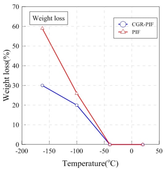 Brittle fracture occurs when the compressive load is applied to the polymeric foam at a cryogenic temperature. The brittle fracture destroys the side of the polymeric foam specimen such that the degree of brittle fracture can be measured by evaluating the weight loss after the compressive test. Figure 14 shows the weight loss ratio for PIF and CGR-PIF. The weight loss ratio was calculated by dividing the weight obtained after the compressive test by the original weight. Little change was observed in the weight at 20 °C and that at −40 °C. From −100 °C, brittle fracture began to occur in both the materials. At −163 °C, the weight loss of PIF was two times higher than that of CGR-PIF, which shows that the addition of glass fibers helped to prevent the occurrence of brittle fracture.