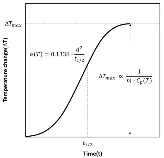 Thermal conductivity is an important characteristic of a thermal insulation material []. The heat transfer of PIF primarily occurs through direct conduction, and the thermal conductivity is affected by density, cell distribution, and added materials [,,]. In order to investigate the effect of chopped glass fibers in PIF, its thermal properties were evaluated at an ambient temperature using laser flash analysis. Figure 15 shows typical curve of temperature change measured by IR detector. The thermal diffusivity, , can be calculated from the measured temperature change on the rear surface of the specimen using the Equation (2), where is the thickness of the specimen, and is half of the final rise time value. Furthermore, the specific heat, , can be determined from Equation (3), where the maximum value of temperature change, , correlates with the known reference specific heat, , which is in LFA-467 analysis program. Then, the specific heat of the test specimen can be calculated through Equation (4).