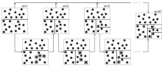 Demonstration of adaptive boosting technique where base classifiers with simple thresholds are trained according to the assigned weighted function acquired relative to the precision of the previous classifier in data allocation. Each sample shows the number of classifiers, m, trained up to that point. The solid and dashed lines in the domains are the decision made and revised choices, respectively, based on the weight of the misplaced data illustrated with expanded boundaries.