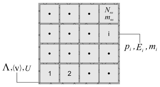 Schematic representation of a microcanonical ensemble with equal probability of state, , and energy, , of each subsystem in the total volume, , with the average velocity of and energy U.